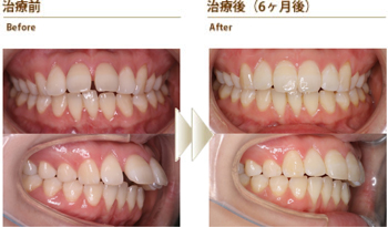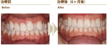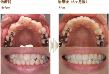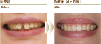 上の前歯に隙間があり笑うと黒く見えることと、出っ歯なので口が閉じにくいことを気にしていた方の症例です。全体矯正と部分矯正の説明をしたところ、上の前歯だけの部分矯正を希望されました。目立たない装置を希望されたので、Tip-Edgeセラミックブラケットを上の前歯6本につけて部分矯正を行いました。約6ヵ月後には装置を除去し.歯の裏側をワイヤーで固定して歯列を安定させています。 短期間で痛みもほとんどなく前歯の隙間がなくなり出っ歯も改善されたので、たいへん喜んでおられました。写真を撮る時も口元を気にすることがなくなったそうです。